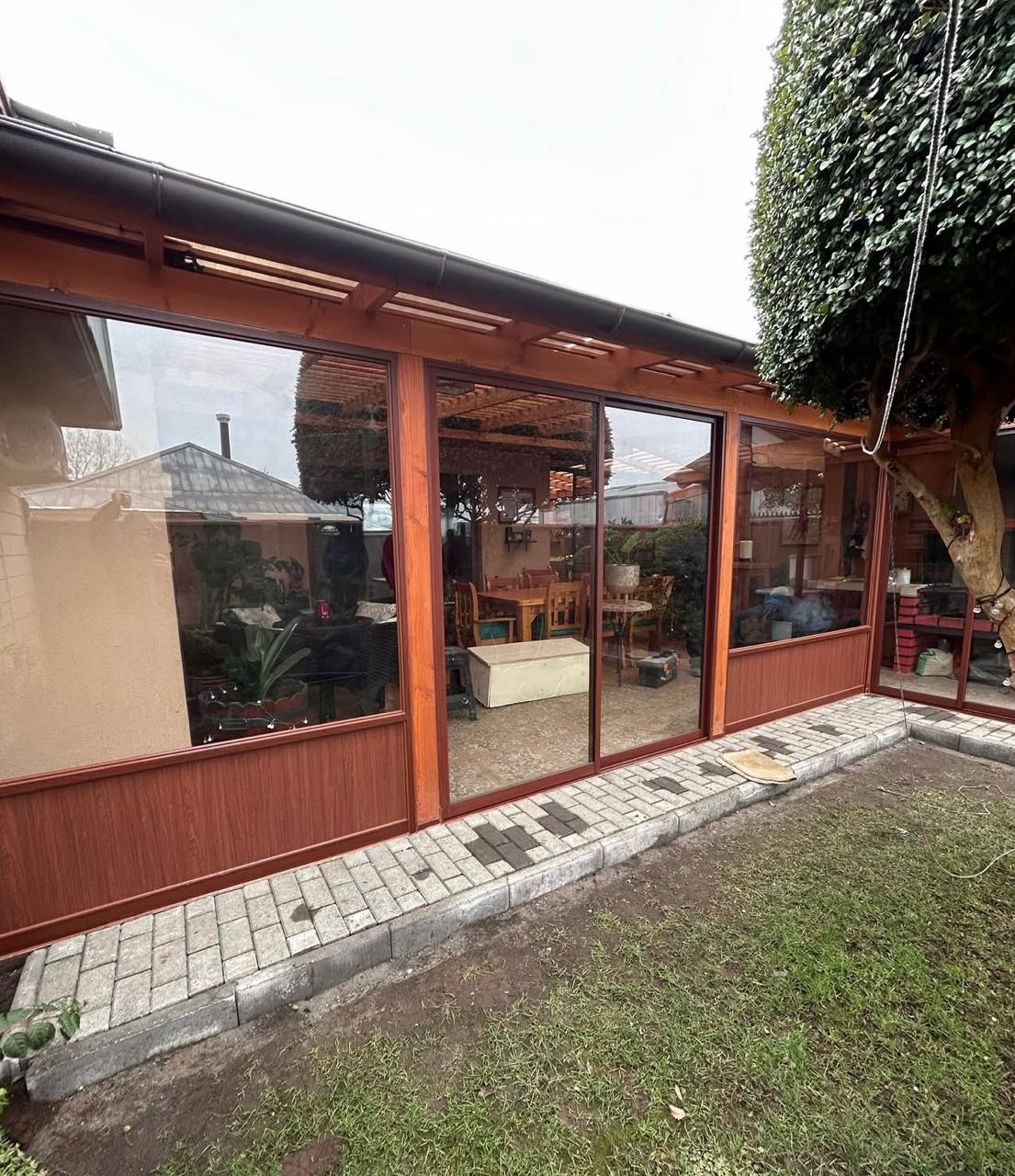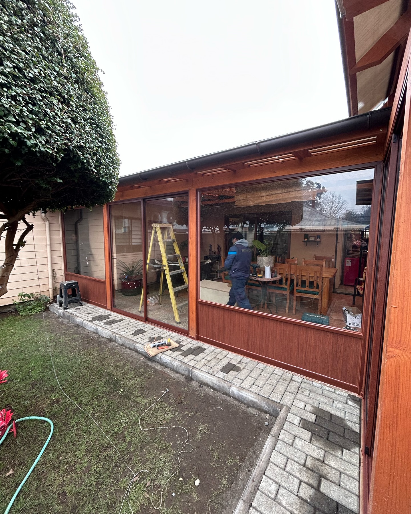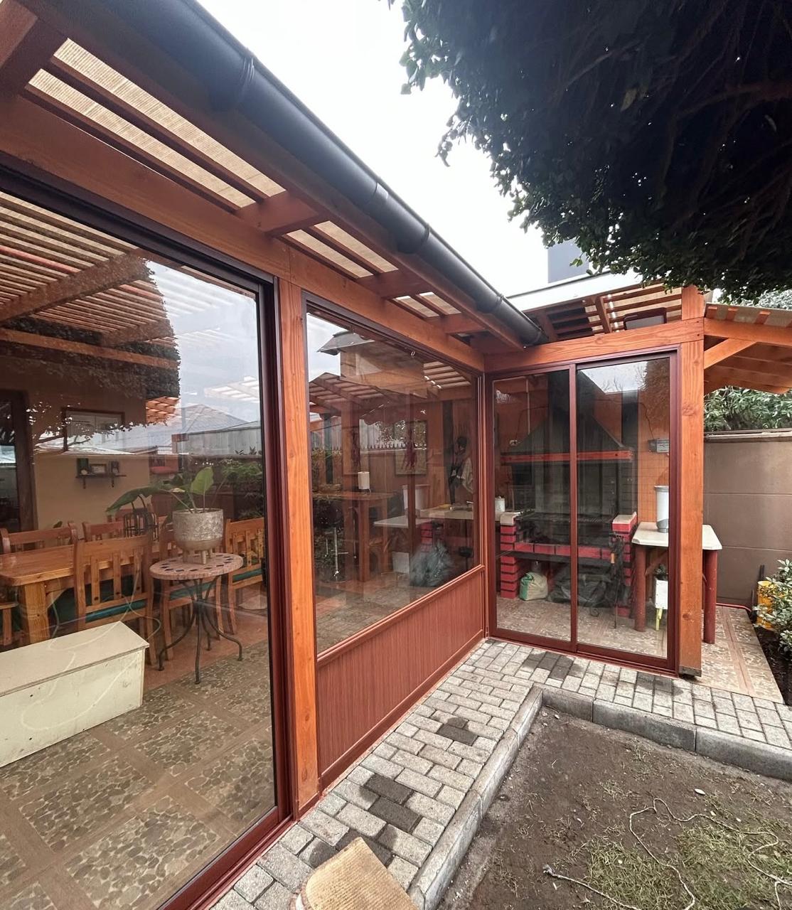Cierre de terraza, en aluminio color Roble cristal incoloro.
