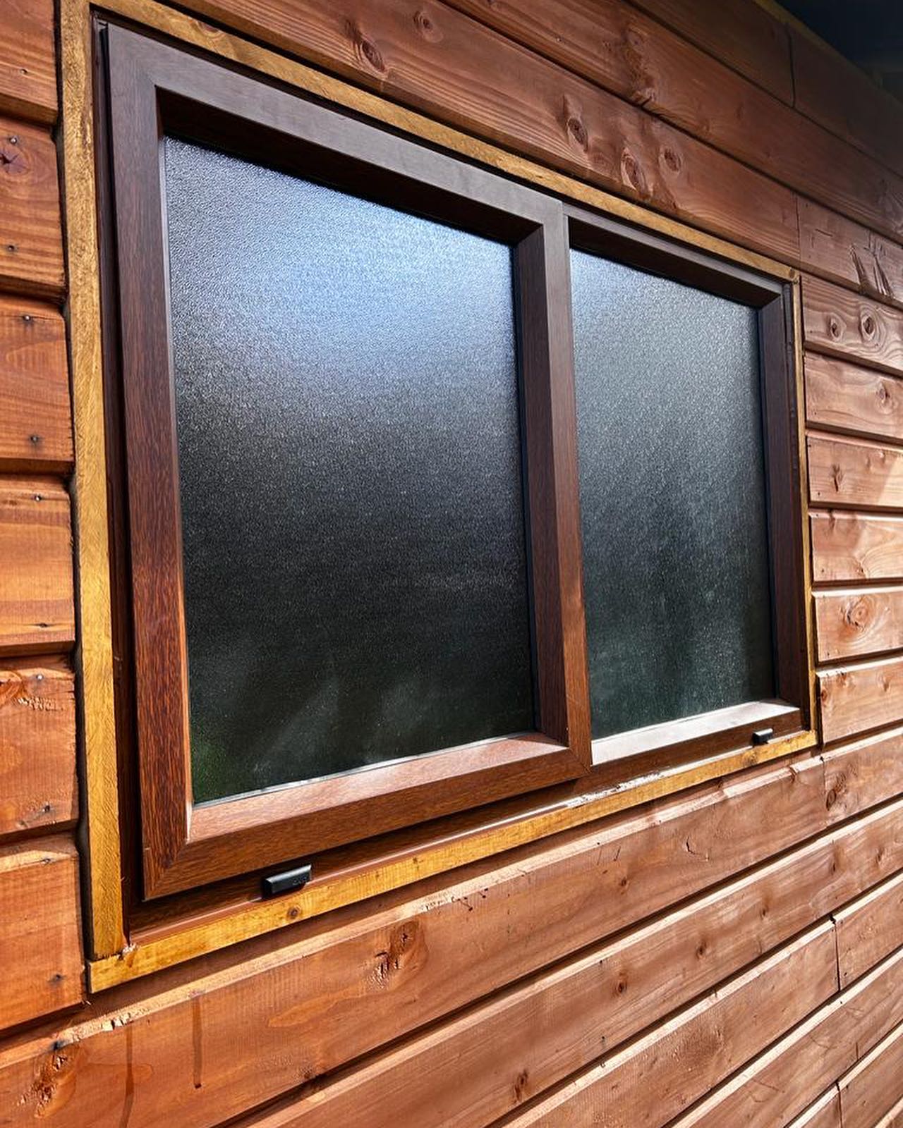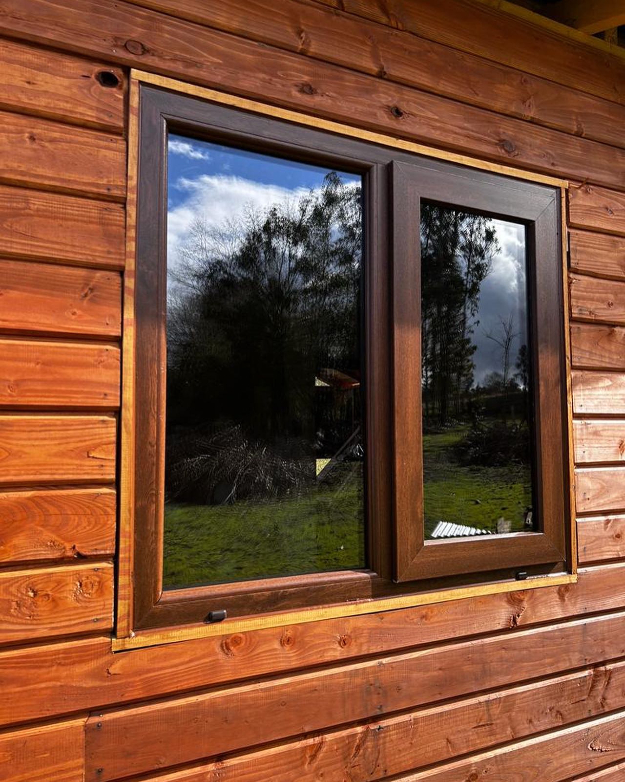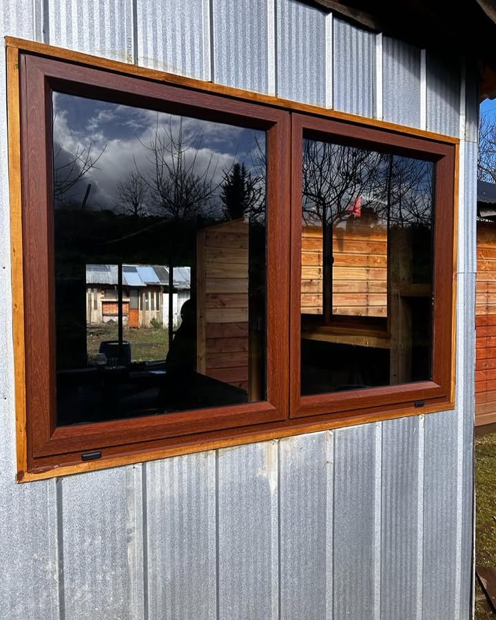 Fabricación e Instalación de ventanas en Aluminio color Cerezo y Pvc color Nogal, cristal termo panel.