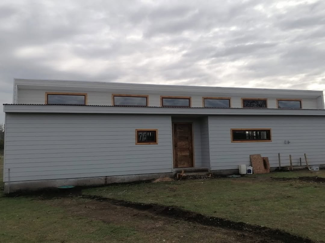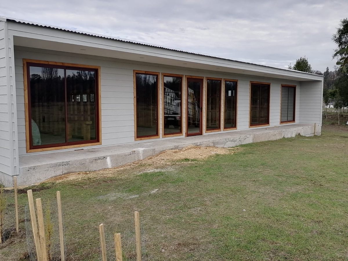 Obra Millahuin, Pitrufquen. Fabricación e instalación de ventanas y puertas aluminio color Roble, cristal termopanel.